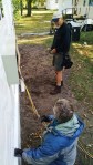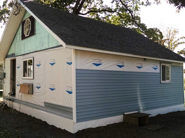 We were all anxious to get started today. Tom and Reid and Suzanne returned to the inside work sanding drywall, and cleaning up from sanding drywall. Later in the day Jackie joined in and worked on priming the living room and kitchen. She got everything cut in today. Otherwise everyone was outside working on siding. The outside is really looking good. Bruce and Max, Jackie and Michael completed the front of the house today. It looks great! Now it just needs a front deck. Anne, Jenny and Hilary worked on siding on the back and side of the cottage. We are hoping it can be at least close to completed tomorrow. We will see how it goes. We will be pushing to the end.