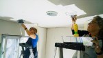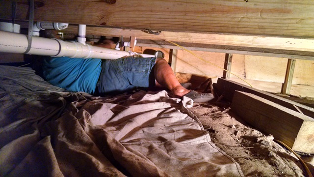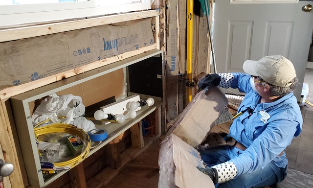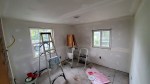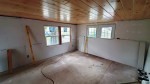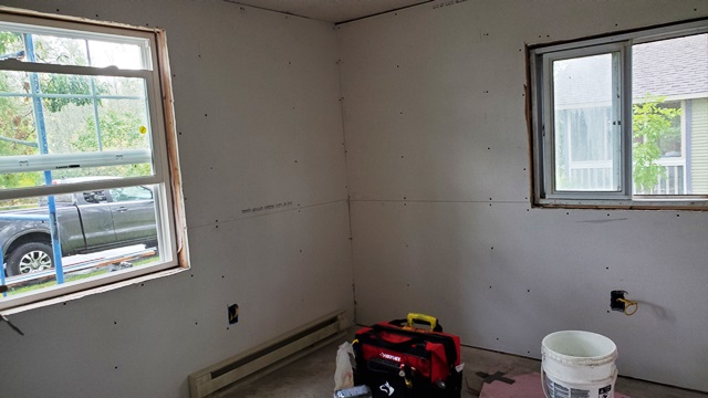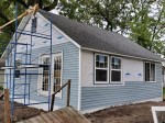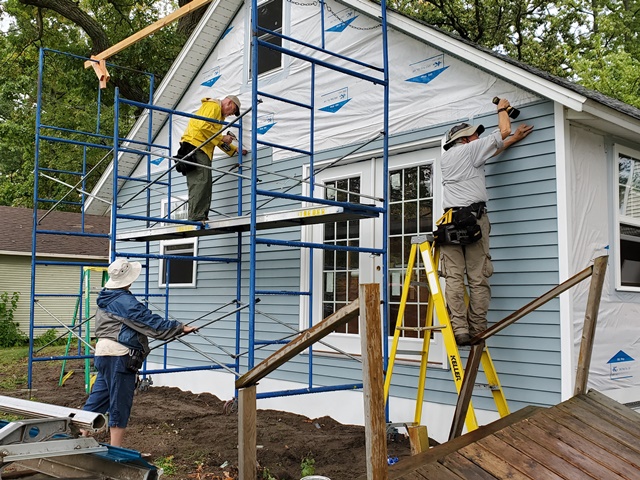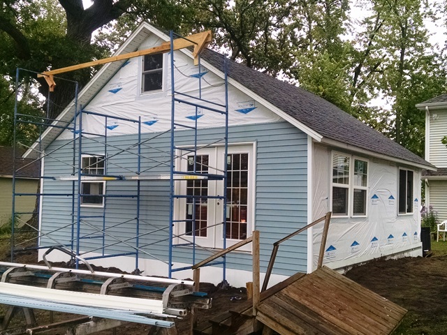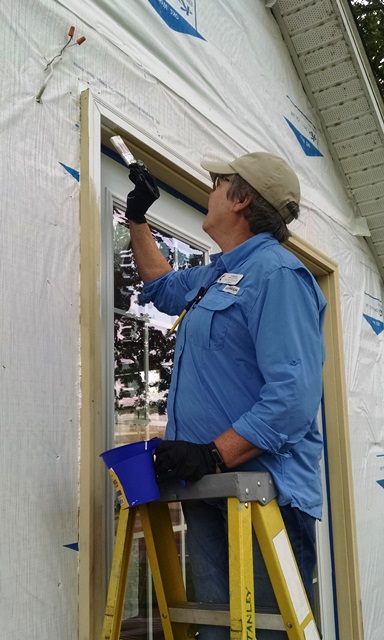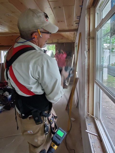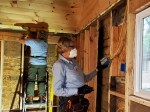 Back to work, Anne went back to taping and mudding drywall. Max and Tom and Mike completed installing all the drywall they can do until the bathroom plumbing is completed. Reid continued to work on that plumbing today. Bruce, Hillary, Jackie and Jenny all began the day working in the cold mist installing the siding. They made great progress – finishing all but the top row on the south side and starting the two remaining sides. The drywall in the bedroom was not dry today. It’s just been too humid, so Dave, the maintenance manager, brought a fan and then later a couple of heaters for the cottage. That seemed to help and by this afternoon at least a portion of the bedroom could be sanded by Suzanne. Jackie also worked on finishing drywall this afternoon. We have all worked very hard this week and are looking forward to getting some rest this weekend.