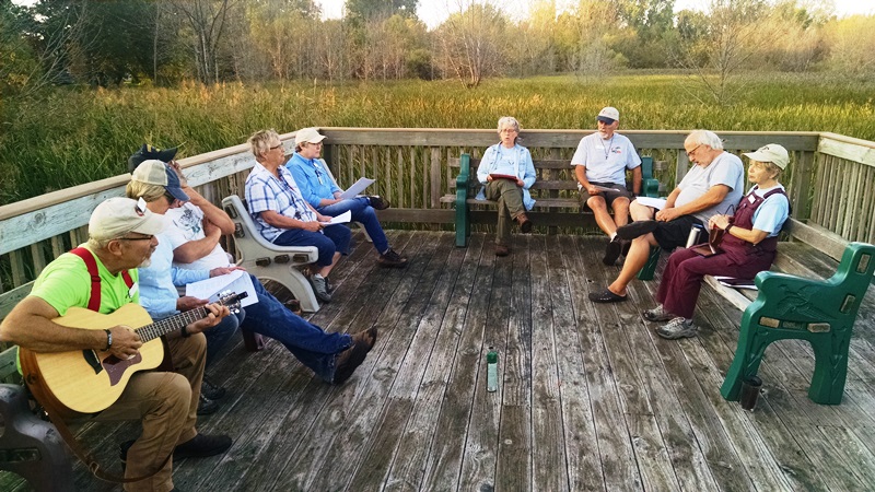 Tonight, Tom and Jenny walked into town with us. It is “Moonlight Madness” in downtown Sebewaing. They closed some of the streets and had various activities. There were inflatables for the kids. Music in the park. Several food vendors and craft vendors. There were also specials/sales at the downtown businesses. The Rotary gave away bean soup which was very good. There was popcorn and apple cider at the library. We all, of course, had ice cream from the antique store. Tried the root beer float tonight and it very good. We also ran into Hillary, Mike, Jackie and Bruce while strolling downtown. We were interested in seeing the fires on the river and waited until they lit the floating fire rings before we called it a night. As we were leaving we had a really nice sunset and stopped on the board walk to get some pictures before returning home . It was another good day.