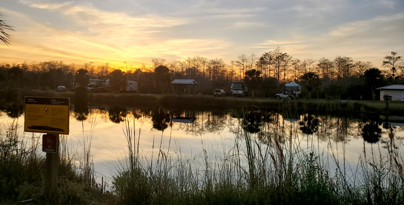 Thursday, we were again in travel mode and drove south to Midway Campground in the Big Cypress National Preserve on the Tamiami Trail. Except for a long delay due to a wreck causing traffic backup north of Naples it was an uneventful day. We did notice that the sun became brighter and the temperature much warmer the further we drove. It was 38 degrees in Gainesville Thursday morning and by the time we arrived at Midway about 5:00pm our camp hosts greeted us in shorts and short sleeve shirts. Nice! Today will be another play day before we head on down to the keys and prepare to go to work. It is a beautiful Florida morning – no jackets today. Don’t know when we will actually get this posted because we have a very sketchy signal here at Midway.