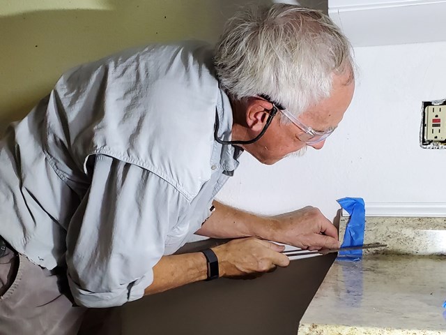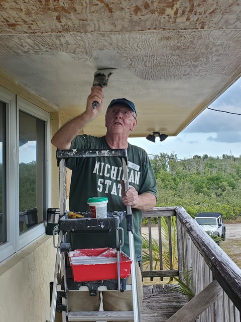 We then drove about a mile to one of the homes the NOMADS are currently rebuilding. At Dennis’s home the entire team (Gene and Carolyn, Ron and Mary, Elaine and Anne and Max) worked on sanding drywall and a few did a little mudding. This home was flooded by the storm surge of Hurricane Irma when most of the structures on the island received 2-4 feet of salt water. We think Dennis’ house was on the low end of that but since he wasn’t allowed back into his neighborhood for some time, by then the water and wicked up all the drywall and mold had begun to grow. It happens very quickly. The house was gutted. Prior to our arrival NOMADS had already installed all the drywall except for one closet. They also began the finishing process. Today the team did a lot of sanding and applied a little more joint compound.
