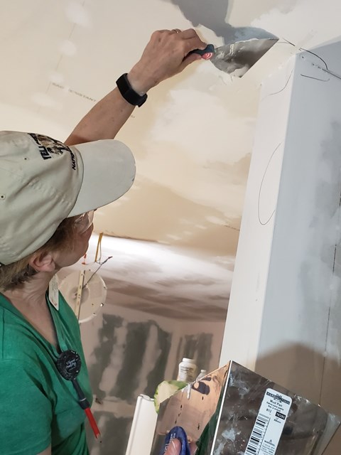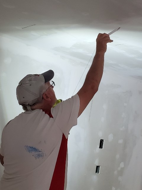 Today, different from the last two day, we worked all day on drywall finishing at Dennis’s. There was drywall dust everywhere. It reminded us that for some reason our May 7, 2018 blog post titled “Drywall dust in the ears, drywall dust in the nose, drywall dust in the hair, drywall dust everywhere!” shows up regularly as being visited on our blog. In fact it seems to be the most visited post. Don’t really know why.