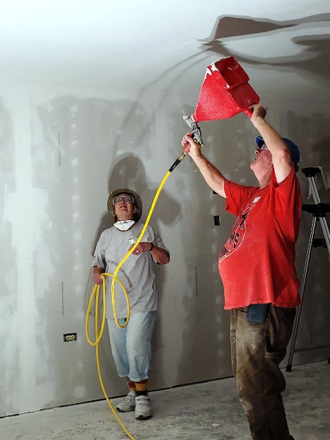 After devotion and planning tonight’s dinner, Max, Kathy and Larry drove back to Sugarloaf Key to a new to us house. Bob’s house is almost completed and they went there to work the punch list. There was some touch up painting, installing trim, and cabinet parts, repairing “plumber’s” hole in drywall and caulking. They will have to return on Monday to continue working the list. The rest of the team went back to Dennis’s house and were joined by the team of college students who worked at the Sugarloaf Key house yesterday. The students joined in sanding drywall in the back bedroom and then in the living room. They seemed to be a good group and we enjoyed having them join us. While the students were sanding, our team textured the kitchen ceiling. Dennis made the final decision to texture the walls too so guess we will work on that next week.