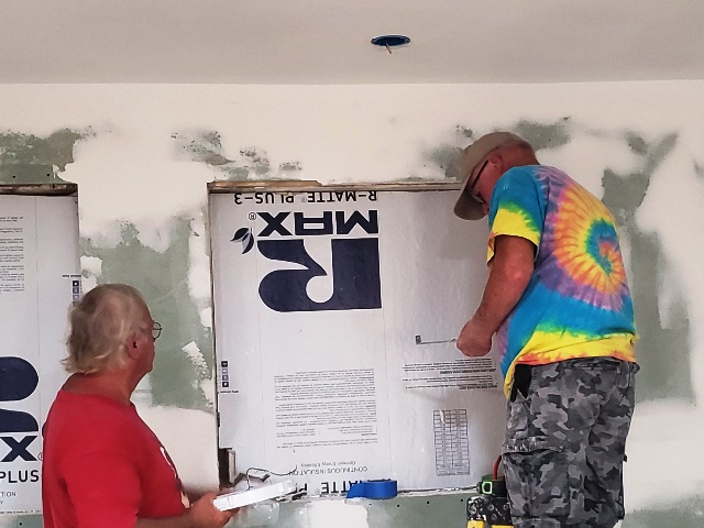 Today Max took Glenita and Steve to Sugarloaf Key to continue work on Bob’s house. Today they hung 2 sets of closet doors, repaired a hole in the ceiling drywall, touched up some paint. The rest of the team – Larry, Kathy, Elaine and Anne returned to Dennis’ house. Larry installed the four new kitchen ceiling lights while the rest of us did the final sanding/prep on the walls in the kitchen and living room. He also did some work on the hall and bedroom drywall. After lunch the ladies, with the help of Dennis, began the priming of the walls. By the end of the day one short section of wall was all that was unprimed. We were very pleased with the appearance of the walls with the primer in place.