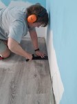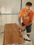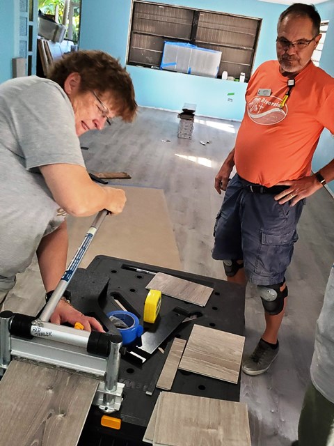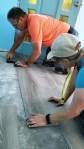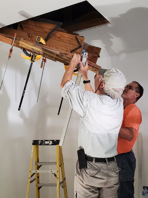 For the most part it was a painting and flooring day for us with the whole team at Dennis’s house again. Sara and Karen painted the ceilings that we textured yesterday while the rest of the team worked on flooring, except when Greg, Max and Dennis were busy putting a new plywood cover on the attic pulldown steps. After painting Sara helped with the flooring. At the end of the day the flooring was finished in the kitchen and almost finished in the living room. Another productive day.