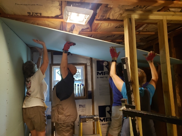 Max went to morning meeting today with Gumby in his pocket. Dan had given him a heads up last night that things were going to be different today. And they were. This morning Max and Mark headed to Home Depot for supplies for Dennis’s house and after returning with those went to a house a couple blocks away to assess the situation surrounding a water heater. While they were doing that the ladies began hanging drywall on the ceiling of the bathroom at Dennis’s. There are many ins and outs and not an easy task, with many cuts. There was wonder board to be installed on the walls around the tub. It got crowded in that little bathroom at times today. Big sheets of drywall and four to seven people. We were dancing around in there at times. But again today as every day, it was a good day. God continues to bless and keep us safe. Progress continues to be made for our homeowners. And now we have another weekend in the beautiful Lower Keys.