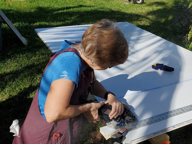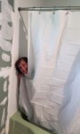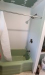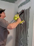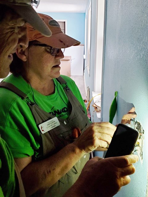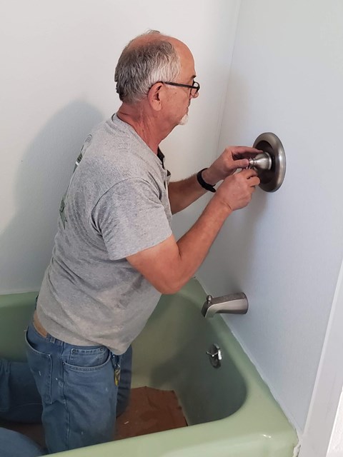 After morning meeting we all headed back to Dennis’s house. Our goals for today were to get his shower so he can use it and work our punch list and continue cleanup in and around the house. It was a busy day. Anne, Max and Sue began by preparing the freezer board for the shower walls. Lisa and Mark worked on the punch list by replacing and repairing electrical outlets and switches and painting the electrical box in the kitchen area. It looks so much better. Dan and Virgie spent a very hot morning working on cleaning up part of our construction debris outside. After cutting all the pieces and dry fitting everything the installation in the shower began after lunch. Everyone was in the bathroom at some point in the afternoon. The gluing of the freezer board, caulking, shower rod and curtain kept us busy. It was a little after quitting time when we were finally able to turn on the shower and show Dennis everything was working again after 10 days without his shower. He was so happy. And so were we. Next week we will be back to working the drywall.