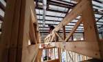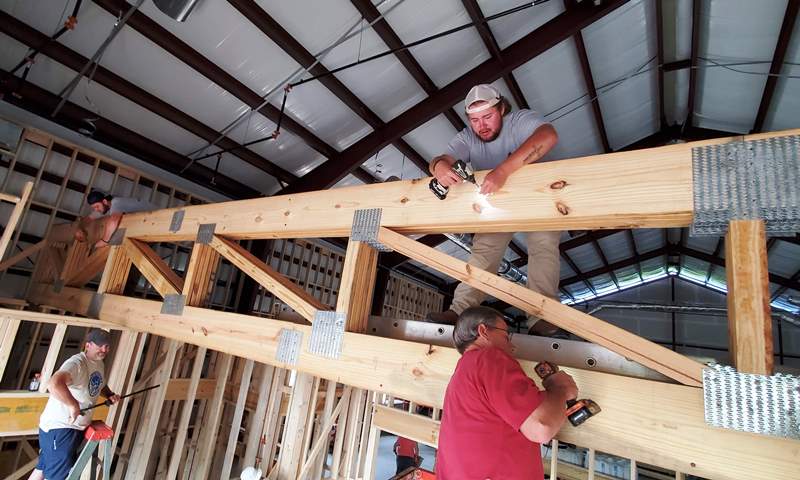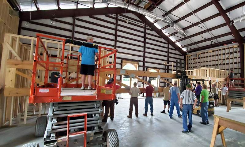 We used a forklift to lift the truss beam sections onto the walls where they were placed in a temporary holding position.