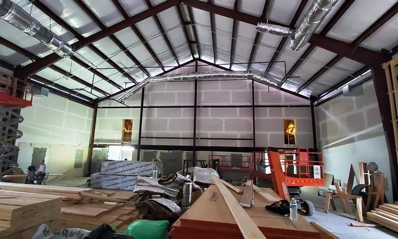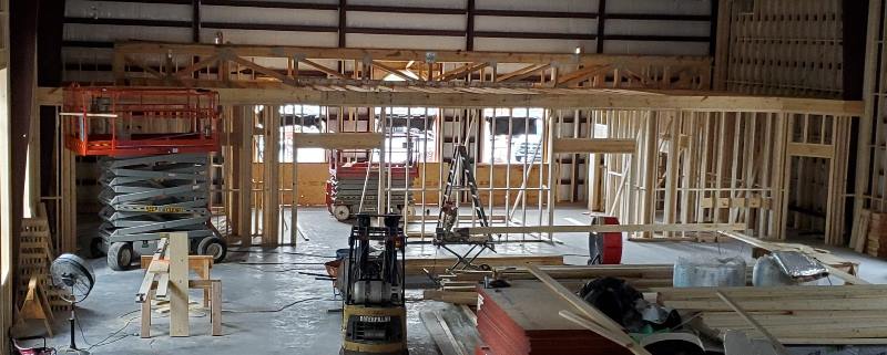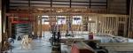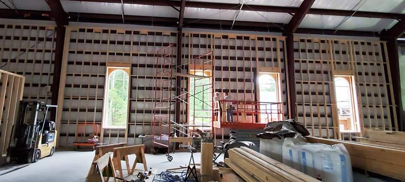 The project is really moving forward. Today the fire-break drywall installation and mudding was completed. Both bathrooms in the vestibule framing was completed and some of the headers installed. The major accomplishment of the day was the moving of the truss beams that will support the balcony in the rear of the sanctuary inside the building and carefully placing them upon the walls. It took careful orchestration of people and lifts to accomplish the task. The work on installing the fire blocks in the walls is continuing as well.