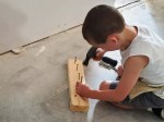 One of our young volunteers learning to drive nails. He wanted to build something for his mother, so one of the ladies on the team helped him get started with this necklace holder.