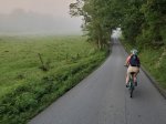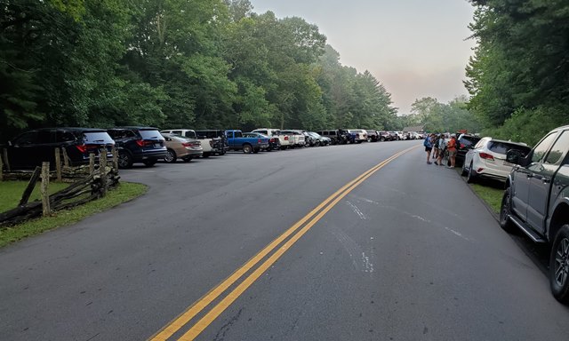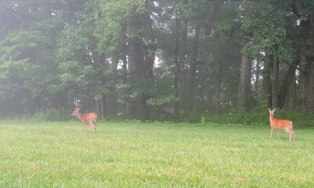 So we are still in the Smokies and this morning we were up early to drive to Cades Cove. Cades Cove is a broad, verdant valley surrounded by mountains and is one of the most popular destinations in the Park. It is know for its wild life viewing, beautiful scenery, and hiking trails. Cades Cove has an eleven mile loop road that circles the cove and this year they have made all day each Wednesday vehicle free. It is open to bikes and pedestrians only. It supposedly opens at 8:00 but we were there before 7:00 this morning. The parking lot was already full and we, along with hundreds of others parked on the side of the road. As it turns out everyone starts hiking and riding whenever they arrive. You would probably have to be there before 6:00 to get a spot in the parking lot. One person we talked to when we were taking a break told us they rode 2 miles from where they parked before arriving at the start of the loop.