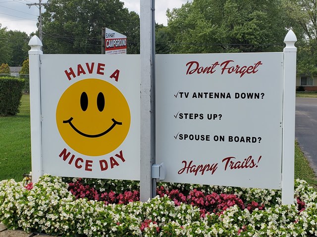 After a nice walk we left the museum en route to Elkhart, Indiana. We will be meeting here the next three days with the NOMADS committee in charge of the 2021 annual meeting. First meeting was at 3:00 this afternoon. It was good to see everyone and hard to not hug some dear friends but we wore our masks and everyone kept their distance. So tired of Covid! The meeting ended a little early because on an approaching severe storm. We all pulled in our slides and put all the chairs and outside stuff away and then returned to the more secure building to ride out what were predicted to be 70mph winds. It was an impressive storm but no damage in our immediate area. Not too far away there was some damage. Again we were blessed and it reminded the committee of the need to have emergency plans in place for the meeting. It was another good day.