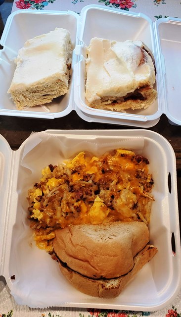 Early this morning we had a rain storm at the Grissom Air Museum. We had to wait for the rain to end so we could walk about two blocks to the Dutch Cafe, a local restaurant with good ratings. We were definitely glad we waited. We shared the country scramble which was three eggs, bacon, hash browns, cheese and toast made from home made bread. Very, very good and almost more than the two of us could eat. Some of you will find this hard to believe but we didn’t even eat any of the cinnamon rolls. Of course we did share one for our dessert after lunch. Excellent! We saved one for tomorrow’s breakfast.