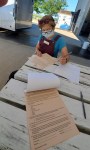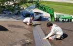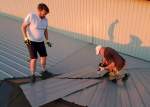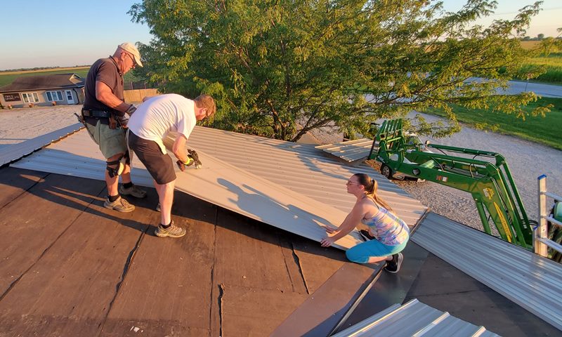 As we mentioned yesterday, we were asked to change directions and come to Midwest Mission Distribution Center to finish out the interior of some new office space. So what did we do? We installed metal roofing.  Semper Gumby! Under the direction of fellow NOMADS Richard and Dianne and with the help of some of their family members, Matt, Breanna and Garrett we installed about three quarters of the metal.  To avoid the hottest part of the day, we worked from 8:00 am to about 1:00 pm, then took a long lunch and worked from 4:30 pm to about 8:00 pm.