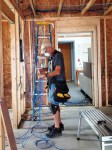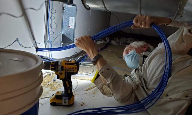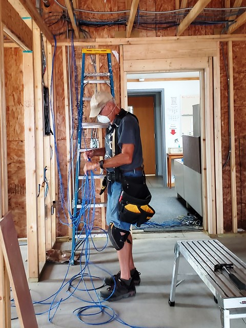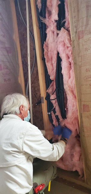 Yesterday started with rain. It didn’t bother us because we planned to be working inside anyway. We continued to clean out the addition, moving items no longer needed back to the warehouse so we will have more room to work. Then, we continued the installation of the insulation. Gary, another NOMAD arrived about noon and after getting set up joined us for the afternoon. He worked on opening up the cased opening between the existing building and the addition. It was a good, productive day. Today began very overcast but ended warm and sunny. We continued with insulation and the doorway, completing the doorway and all the insulation in the exterior walls and put fiberglass insulation in the eaves in preparation for the blown-in ceiling insulation later. This afternoon we ran the cable for the computers through the conduit up to the attic of the existing building and then back down into the computer room. Then we worked on installing vapor barrier. We have about half of that job completed. It was another productive day.
