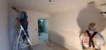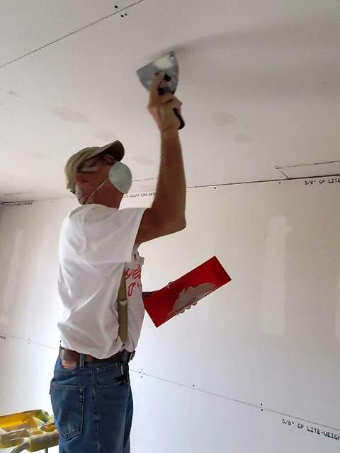 We have completed the drywall!! Well, really we have completed the installation of the drywall. Today we started the finishing process – the mudding and taping. For most of the guys we work with in NOMADS this is not their favorite part. It’s really not the favorite part of the three guys working here, but that’s what we all did today. It’s what we will all be doing probably for as long as we are here. We are really pleased with the progress we are making. We are very tired but it’s a good tired. We will continue tomorrow working to get everything first coated. Life is good!