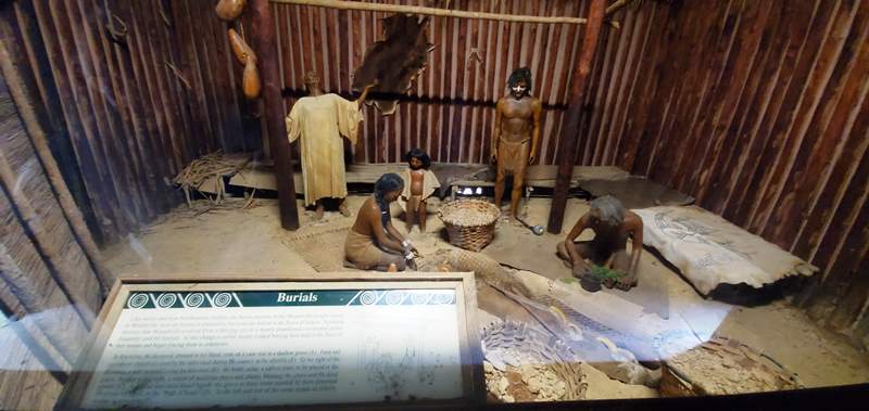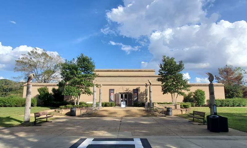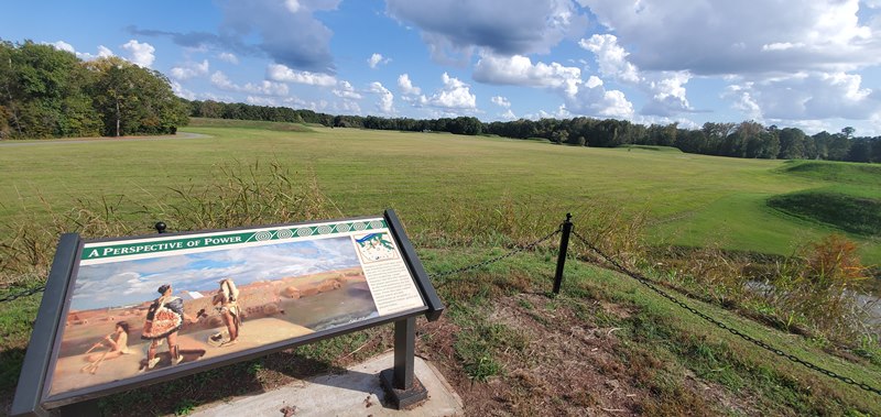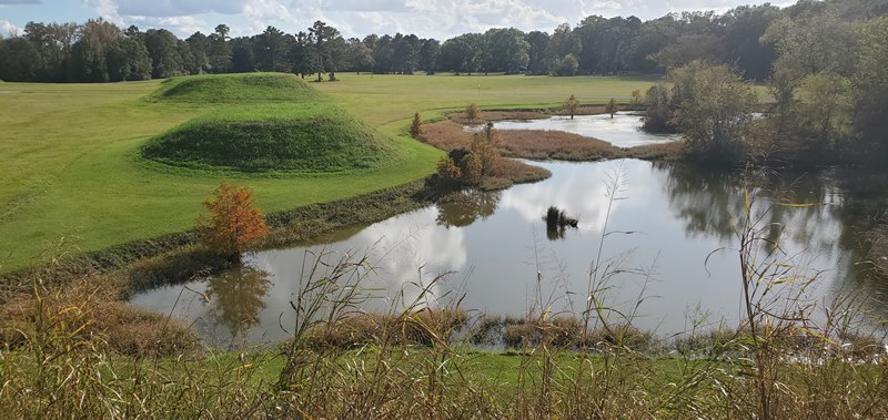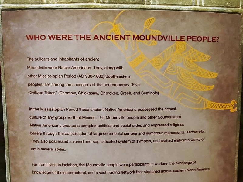 We have really enjoyed our time at Moundville Archaeological Park. The campground is small, and peaceful (except for some close by trains that didn’t bother us.) It’s only about 10-12 miles from interstate 20/59 in Tuscaloosa so not too far for an overnight stop. It’s first come, first serve and we don’t know what it is usually but it is wide open right now. All sites have water and electric and 5 or 6 have sewer. However, there are not very many sites that are large enough for larger rigs – maybe 4 or 5. You should call and check on availability and always avoid Alabama home football game weekends. We spent some time in the museum today. It is well done and informative. We learned that the museum building was built in the 1930s out of concrete, by the Civilian Conservation Corp and it still looks great! We also climbed the largest mound today. It is thought that it was the Chief and his family’s home. At it’s height, Moundville was the largest city between Mexico and New York. There were around 10,000 Mississippian Native Americans living here and it is called the Big Apple of the 14th Century. In the 1960s and 70s you could climb all the mounds but no longer as some are burial mounds and we are much more sensitive about such things now. We are headed home tomorrow before the rains from Hurricane Zeta arrive. Everyone stay safe!