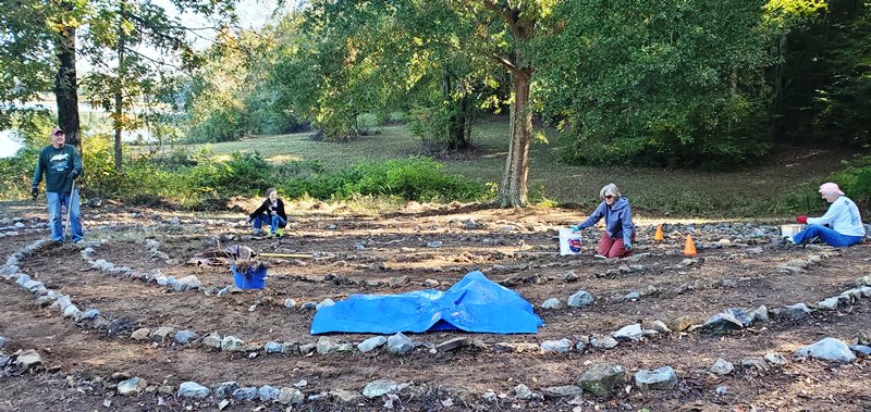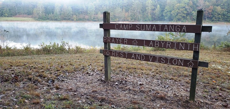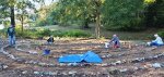 After the grueling day Monday of weeding and cleaning out the debris in the labyrinth at Camp Sumatanga, the work continued Tuesday morning. It was more of the same – weeding and cleanup and digging up rocks marking the trail that had, over time, become buried in the dirt. It was amazing the improvement by the end of the day. We finally had the entire labyrinth revealed. A couple of us actually walked the entire path and found it is ½ mile walk to the center and back out. There was also more grass cutting and bush hogging. Three of the ladies also began creating a sign for the labyrinth. Wednesday after working on the labyrinth until mid-afternoon, we celebrated the completion of the labyrinth and the installation of the sign. It was very much a team effort with the entire team contributing to the effort. We are very pleased with the outcome. We are praying that people who visit the labyrinth will find a place to pray and meditate and leave with a closer relationship with our Lord. There was also more general landscaping, mowing, and other work done each day.