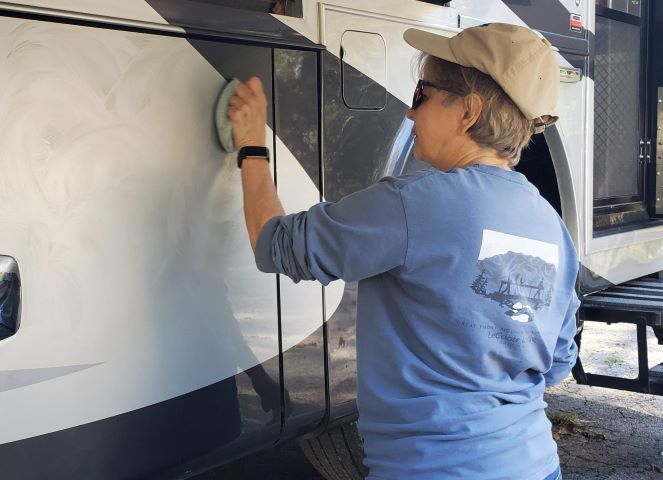 Our leaves are in full color. Our mountain is so very pretty. It is also time to do all the fall maintenance items for FRED. We started on Sunday afternoon – a beautiful day – and washed the roof and applied 303 Protectant. Monday, we washed the entire rig. Then we had to wait a couple of days because of rain and more rain. Then we began waxing in sections. As of today, we have the entire rig waxed. Feels good to have that job done. Now we need to do our tank sanitizing that we also do every 6 months.