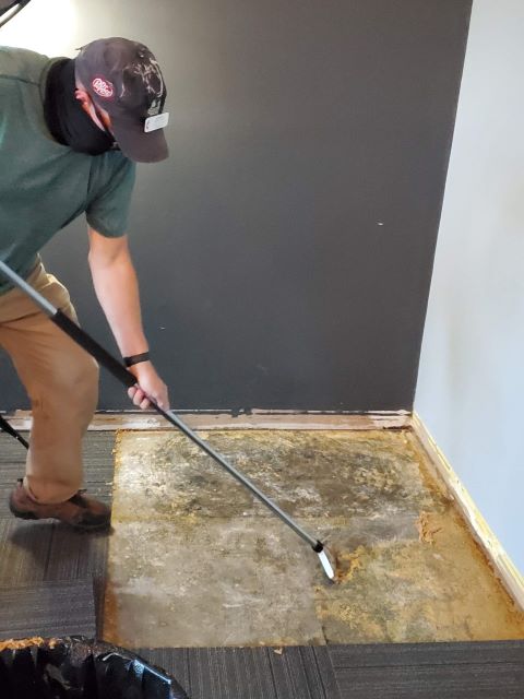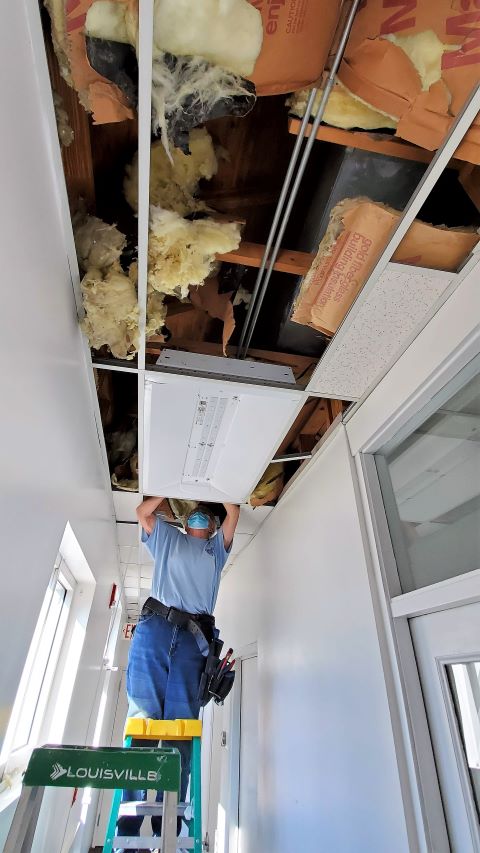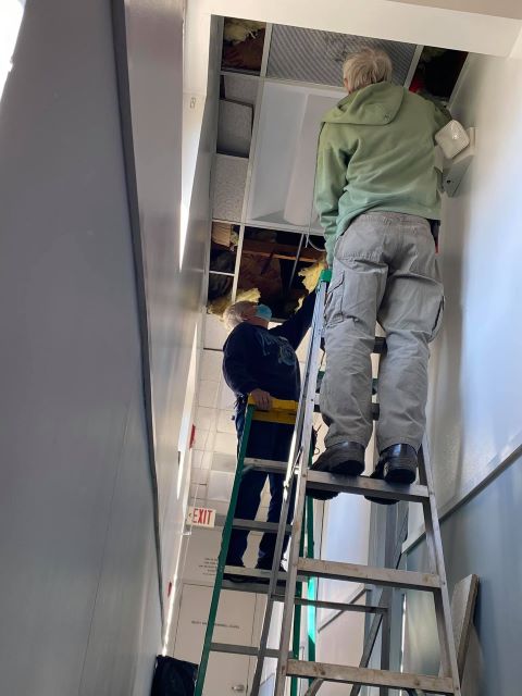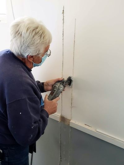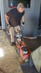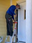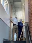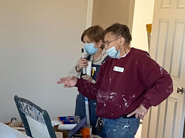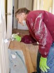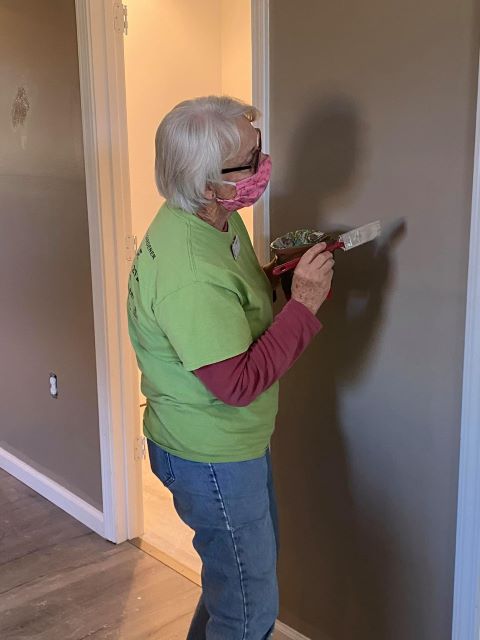 Monday we were all back to work. The entire team headed out to the Wesley Foundation. We stopped and rented a different floor machine that removes the glue left on the floor by the carpet squares that were removed last week. Those who worked at the house all last week got to see what was going on at Wesley and then Kevin, Suzan, Jodi and Anne headed back to the house. We had lots of painting to complete and fortunately Kevin and Suzan are a great painting team. Monday, after looking at the bedroom repair and spot painting we did Thursday, we knew immediately the entire room had to be painted. The bathroom, after priming last week was ready for paint. Kevin and Susan tackled both of those rooms. Anne was so involved in other items that she didn’t get any pictures of the painting. Jodi painted the bathroom door and trim as we continued to make items off the list. By this afternoon, we had crossed off most of the items on our punch list.