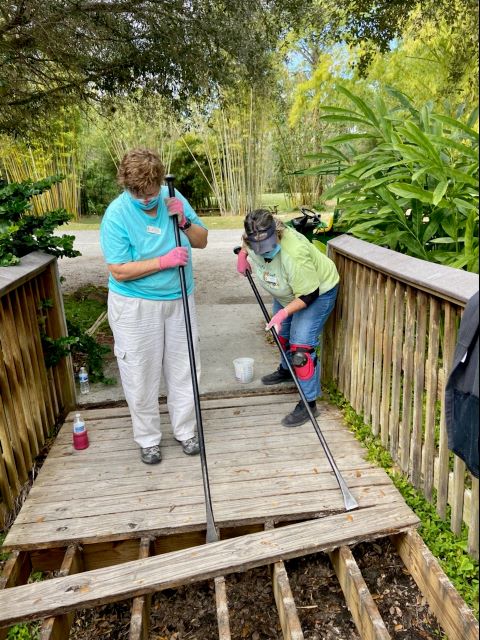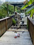 Gregg, Kevin, Suzan, Wanda and Janet spent their day working on the bridge in front of the gift shop. They removed the wooden deck boards, and assessed the structure. It is in need of a few repairs prior to the installation of the new Trex deck boards. (Thanks, Suzan for the photos.)
