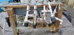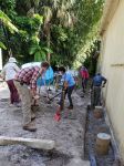 It was another beautiful day for us to head back to work. We had devotion with the staff at ECHO again today and then Max, Anne, Karen, Ken and Vi went back to the bamboo pressure treatment area. Now that the footings are in place and the concrete cured, we began working on reinstalling the French drain that we worked so hard to remove last week. We then covered the trench with stone. After that we began working on putting together the scaffolding (we are missing a few parts.) and preparing to install the ledger board. The board is ready and holes are drilled. Tomorrow morning with some help/strength from the rest of the team we will get it installed.