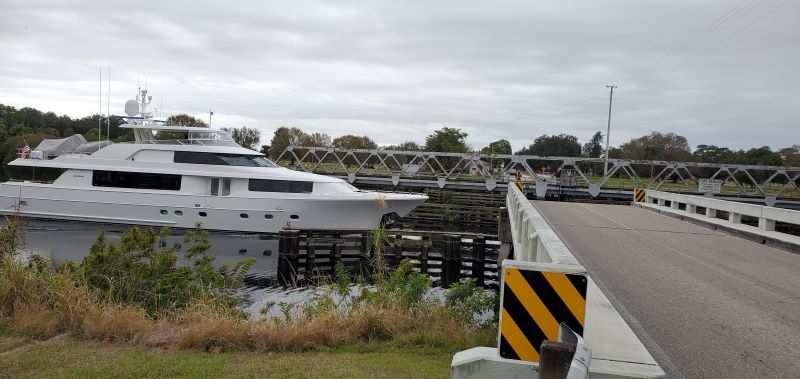 Today was a grey, chilly day. We of course began with our worship service. We continue to be grateful for our connection to home through our weekly worship. This afternoon we headed to another LaBelle park and went by way of the Fort Denaud swing bridge across the Okeechobee waterway. This bridge swings open 90 degrees rather than opening upwards like a drawbridge. You don’t see this type bridge as often. Even more different, the bridge tender is in a small concrete building at the side of one end of the bridge. When a boat wants to go through, the tender presses the button sending the arms down stopping traffic. When all the traffic as off the bridge, the tender then walks to the halfway point of the bridge, presses the buttons to swing the bridge 90 degrees (the tender rides the swing). When the vessels have passed, the tender closes the bridge, walks back to the tender building, raises the arms allowing traffic to pass again. Guess the tender gets lots of steps every day. Lucky the weather is generally nice. Wonder what happens when there are storms.