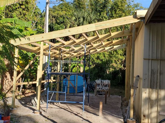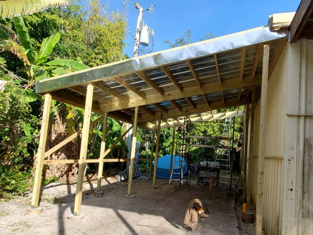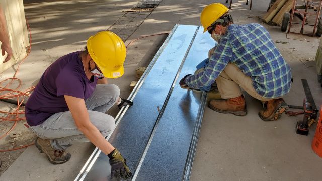 Suzan, Kevin, Ken and Vi returned to our largest project, the bamboo pressure treatment shed. Monday they completed the installation of all the stringers. Today they began the metal work. Max and Greg rejoined that team this afternoon. By the end of the day, all of the roofing was installed except two pieces of metal. It is looking great! We are getting close on this project.