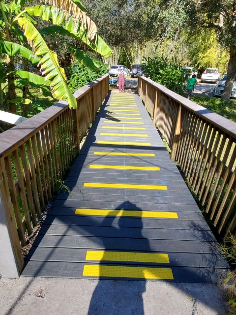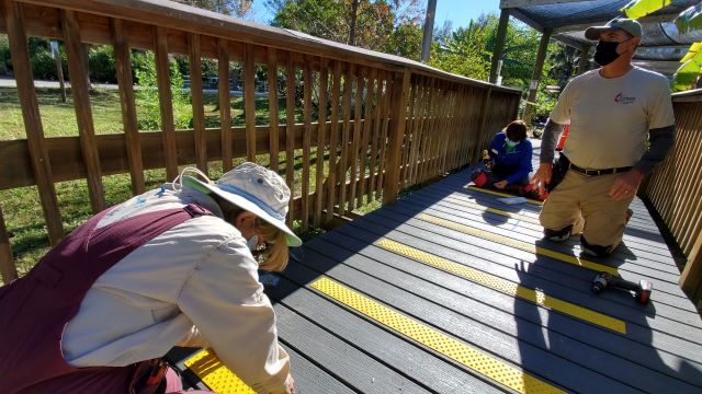 Monday morning we all returned to ECHO to begin our last week here. It’s been a great place to work! Anne and Max returned to the foot bridge with Gregg and Karen to complete the installation of the deck boards and complete it we did, just before quitting time! However, that did not complete the work. Jhon (yes that is the correct spelling) brought us some bright yellow aluminum safety plates to install. We didn’t get the installation completed until Tuesday morning – 23 safety plates with 18 screws per plate. It took until mid-morning to complete. One project complete.