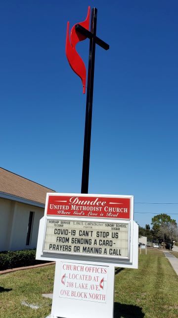 Saturday we finally discovered the time to do grocery shopping and avoid the crowds. We went to Publix at 7:30 am and there was no traffic and open aisles. Since there is some minor sports event near here today and the home team is playing, we knew it would be crowded with people stocking up on game day supplies later in the day. The predicted rain arrived in the afternoon. We had some storms thru the night and were under a tornado watch for a time. More heavy rain this morning but it stopped before time to go to church. Some have wondered about us attending in person worship. We were assured by our team leaders that Dundee UMC was doing everything possible to ensure everyone’s safety. The first Sunday we sat in the very back so that if we felt uncomfortable we could slip out. There are maybe 30 people in the sanctuary, so people are spaced out nicely. Everyone uses hand sanitizer on entering the building, has their temperature checked and are required to wear a mask. At the start of each service everyone recites their COVID Covenant: