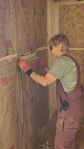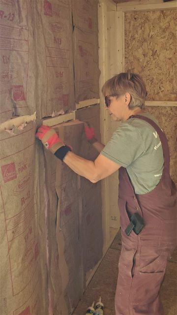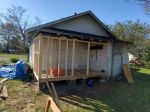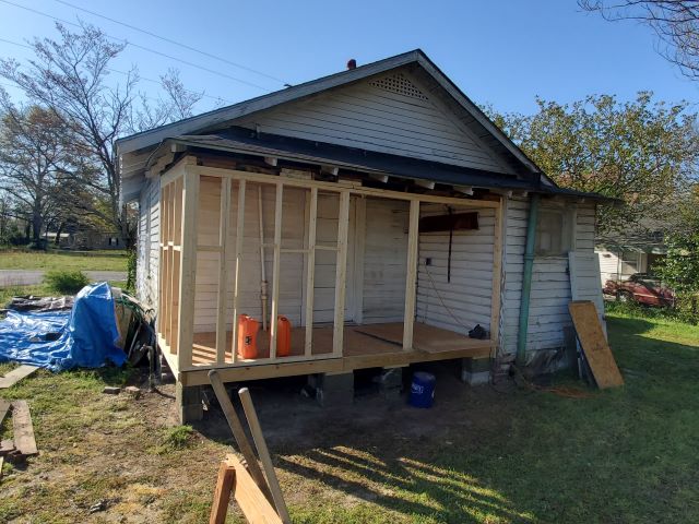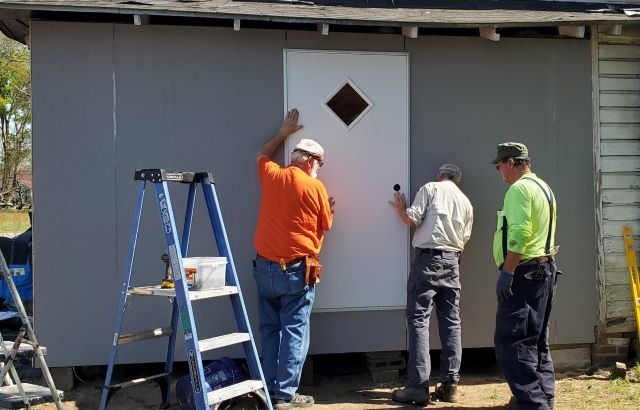 Today we had devotion at 8:00 across the street in an old church building that is now owned by the town. They allow NOMADS to use the building while we are here. Since we didn’t have a team meeting yesterday, this morning also served as our orientation meeting. All the team members already new each other and had worked together previously. This week we have a seven member team in 4 RVs. We are working on a small house that is about 100 years old and back in the day was a “mill” house. It is in McColl, close enough to Tatum for us to return to the RVs for lunch. Last week the team did some inside work and removed the back porch and began the rebuild. Today we began by installing OSB flooring (to have flooring installed later) and installed the last three studs. Then we installed the siding and insulated the exterior walls. The door and lock and ceiling light were installed. It was another beautiful day.