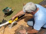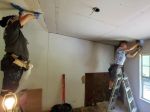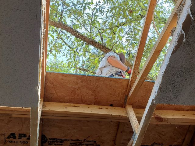 Wednesday morning (while still somewhat cooler,) we cut down a large cedar tree that would have prevented the trailer from being moved. There is additional landscaping that will have to be removed but it was great to remove the large cedar while Ken was still with us. He has a lot of experience downing trees as a fire fighter who worked a lot of CA wildland fires. The roof was also re-tarped since the singles will not be replaced until after it is moved. The rest of the day was spent insulating the walls, ceilings and helping Robby hang the drywall on the ceilings – another tiring day. Wednesday night we visited the Glory House, one of the sponsoring agencies of this rebuild, for dinner and got to know Hope and Grant. What a sweet couple who have such a heart for the people of Laurel. Thanks for a great evening!