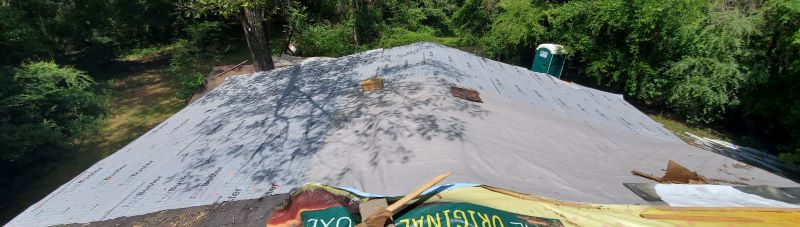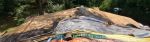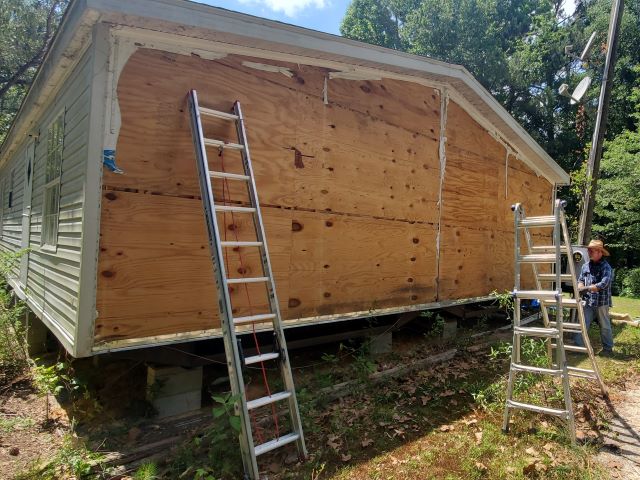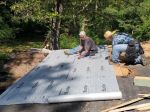 The week continued to be very hot and Tuesday was pretty brutal. Ken and Robby were back up on the hot roof, installing the felt and making additional repairs. The bedroom temporary wall was removed and trusses were reinforced. Caulking was removed in the kitchen and cabinets were sanitized again. The living room wall was also insulated. In the afternoon we all worked together removing the siding from the end of the trailer. Recall we removed the other end two weeks ago. It was way hotter today, but we completed the job and covered the end with tarps to protect the wood from the weather. At this point the double wide is structurally secure and can be separated and moved as soon as the new site is ready. The agency will have a contractor who moves double wides regularly handle all of that work.