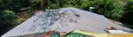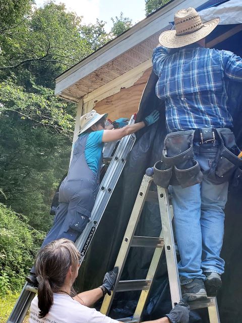 As we start our third week in Laurel, the short spring has turned to summer. We will have 90 degree temps this week and will have to be careful to keep everyone hydrated. We of course began today with a planning session with Robby and then our morning meeting with Ken and Heidi. Our number one goal for this week is to get the roof repairs completed and the roof was where Max, Ken and Robby began their work day. Heidi and Anne were outside helping as needed. The guys got all the rotten and warped decking removed and replaced with new material over the master bedroom as well as the master bath. They also reinforced more trusses. They then moved back to the front, investigating the area in the living room that has been leaking. There they removed more shingles and found there was also rotten decking there as well as the valley tin needed replacing. So, they again reinforced the trusses in that area and replaced the decking. The shingles will not be replaced until the trailer is at home on the new property so the tarps will remain on the roof until after the move. Cannot believe how much work was completed on the exterior today! The inside is also coming along. Everyday there is more cleaning done and the house smells so much better. Today the insulation was replaced in the living room wall. All the old caulk was removed in the hall bath and the tub re-caulked. We will be needing some new trim for the vanity. Heidi also did a great job cleaning and painting several ceiling spots that had mildewed. Some cabinet repairs were done and a few more are needed in the kitchen. It was a very productive but hot day. We all made sure we were drinking lots of water and we extended our breaks a little due to the heat on the roof. We should all sleep well tonight.