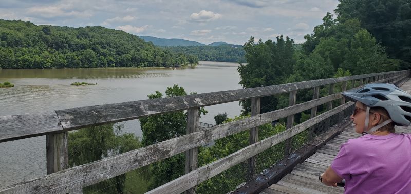 After lunch, we got our bikes out and road 8-9 miles on the New River Trail State Park.  This is a 57 mile rails-to-trails Virginia State Park.  The park goes right through Draper.  We rode from the farm less than ¼ mile to the trail.  The section we road runs along the bank of the New River for most of the way.  It is a mostly smooth crushed gravel surface that is shaded almost all the way. Very clean and well maintained.  It may be our new favorite rail trail.  Really nice ride!  What a fun and relaxing time we spent in Draper.  We do hope to return one day.