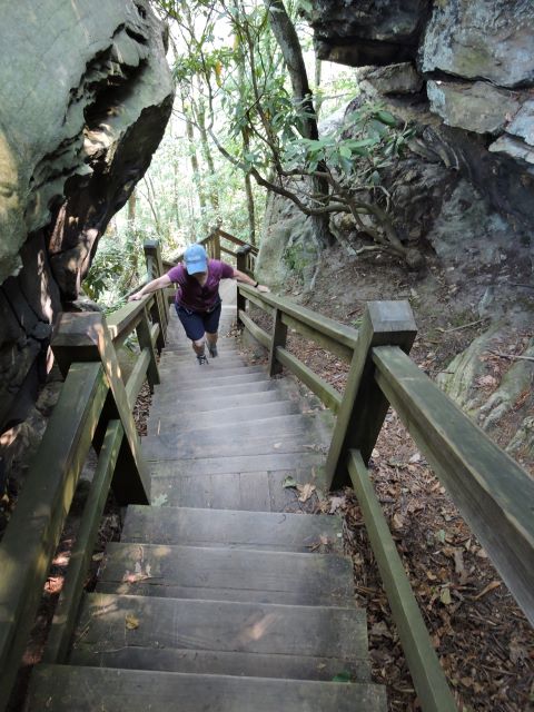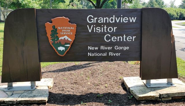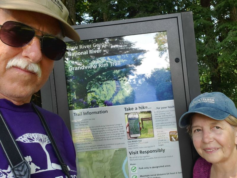 As soon as we were settled, we headed toward the national park. Along the way we spotted the Grandview Diner and Grandview Country store. Both required a visit. We had a BLT and a homemade cheeseburger at the diner. We will probably go back there again before we leave. The country store had some great looking produce as well as jelly, jam, candy, furniture, gravel, fertilizer and anything else you might want. Interesting place. Then we headed to the park’s Grandview Visitors Center. (They have four Visitors Centers.) First, we got our Park Passport stamped, and picked up some maps, and then we were off to explore the park. We first went to the main overlook to get our first look at the New River Gorge. Wow, impressive! It is grand. We hiked a short, easy Tunnel trail and then headed out on the more strenuous Grand View Rim Trail. Beautiful hike. Peaceful, lots of shade and birds singing everywhere. Surprise! When we made it to the end of the trail at Turkey Spur Rock, we still had to climb 150 steps to the top to enjoy the amazing view. It was worth it. Of course, then we had 150 steps back down and the return hike to the truck. It was all good! Another wonderful day enjoying God’s creation in places we had never visited and we get to add West Virginia to our map.