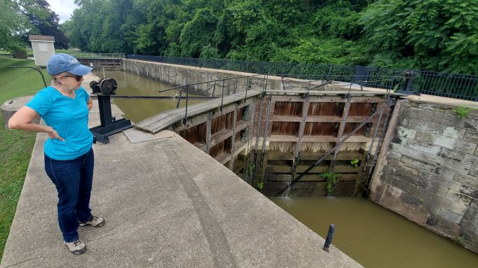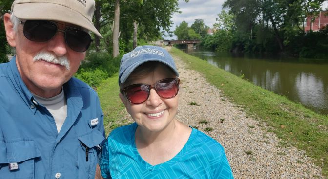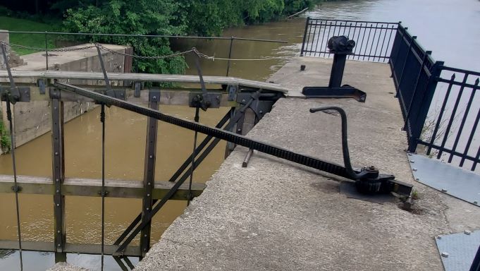 Today we found a little trail on Alltrails in downtown Zanesville along the river.  The river is muddy and running fast due to the rain but it was a nice little walk and very interesting.  The Muskingum River runs right through downtown Zanesville and we walked out to Historic Lock #10 on the Muskingum.  This was our very first time to see a manually operated lock.  Very interesting.  Unfortunately there was no river traffic today so we didn’t get to see the lockmaster open and close the gates for a boat to lock through.  It is very tempting to return and rent a boat just to lock through.  When we still had a boat, we locked thru on the Black Warrior, and Tennessee rivers many times but all the lockmaster did was press a button to sound the horn and then another to open or close the gates.  We were glad to find a video of the manual operation to share with you.  Hope you enjoy.  We had no idea this type of gates were still in use.  Love new experiences like this.  It’s what RV travel/wandering is all about.  The rest of the day was spent catching up on paperwork and getting a little rest.