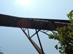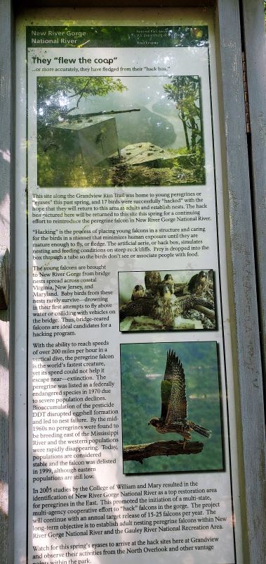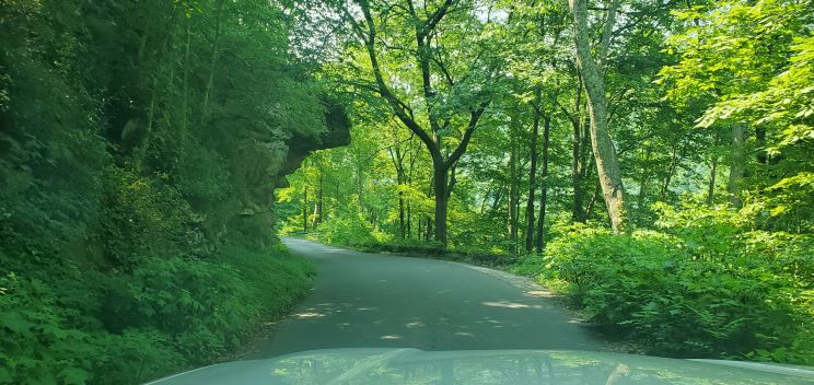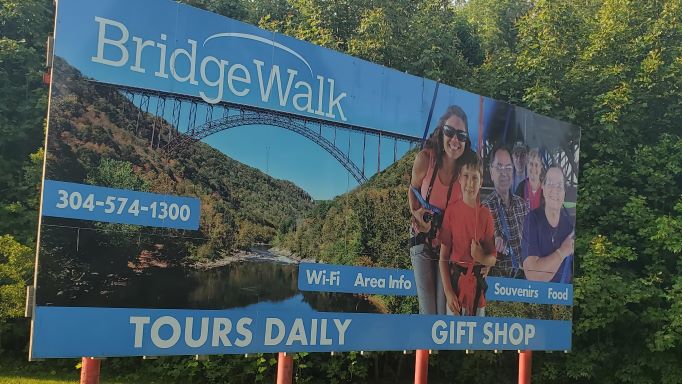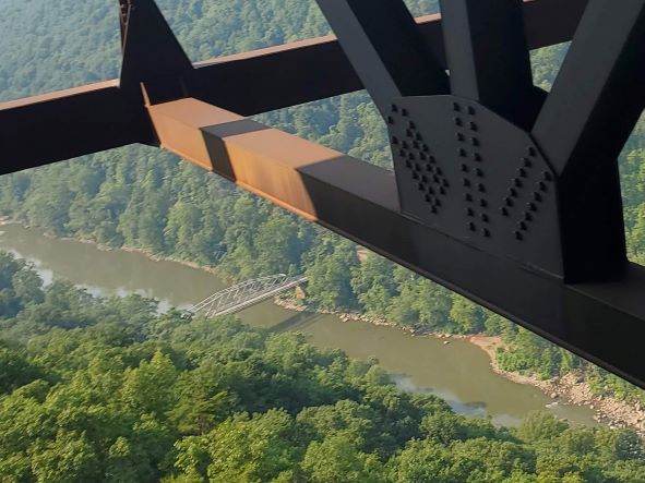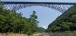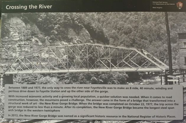 After a last quick stop at the Canyon Rim Visitors Center, we headed south to the Sandstone area of the park. We did have to make one quick stop at Dairy Queen because we had just completed a hike. Our visit to the Sandstone Visitor Center meant we visited all four of the New River Gorge visitor centers. There was another short film to watch and of course we stamped our passport book. The Sandstone Falls are one of the attractions in this area of the park so we drove toward Hinton to the Overlook to take a look. Unfortunately with the trees in full leaf, there was not much to see but a few small glimpses of the falls. So we drove on towards Hinton which is another interesting community at the bottom of the gorge. On the drive down to the bottom you have the mountain immediately to the left of the road, the railroad track immediately to the right and immediately to the right of the track there is a small sliver of land where the homes are built. When we finally reached the bottom of the gorge there is a larger than expected although still small quaint little town of Hinton with several interesting shops and restaurants. After a drive back up the other side of the river we finally came to the Sandstone Falls. At only about 30 feet, they aren’t nearly as high as many we have seen but there still very pretty falls reaching all the way across the river. There was also another nice little boardwalk hike to reach the viewpoint of the falls. Rain was on the way and so we headed back to the truck and then back to Fred.