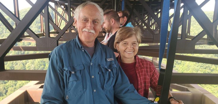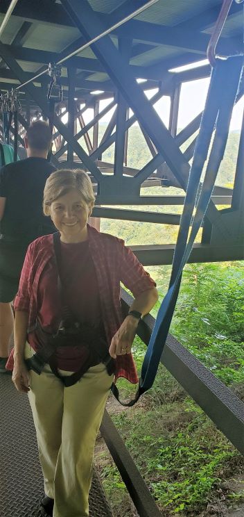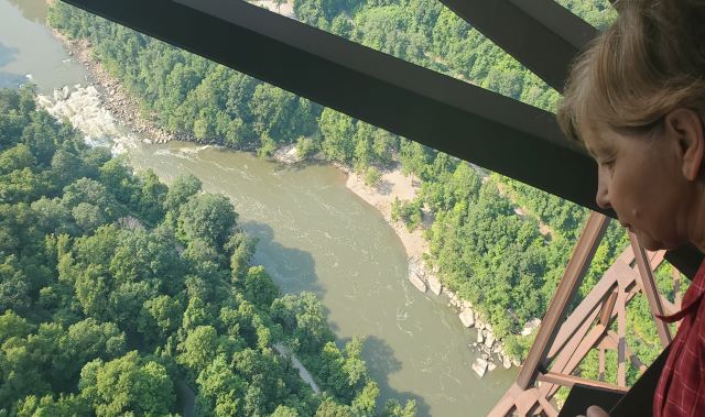 Wednesday was our last day at our newest national park so we tried to be sure we had done the most important items on the long list of opportunities in the park. We began the day heading back to the northern end of the park. We stopped to get a biscuit for breakfast at a regional chain Tudor’s Biscuit World. Very good and very large biscuits. From there we went to our main hike of the day, Long Point. It’s only about1 ¾ mile hike but the payoff at the end is another great view of the bridge and the gorge. At the start of the trail there is a crushed stone section but it quickly changes to the all too familiar rocks, roots and rhododendrons. It’s classified as a moderate hike but we would really call it pretty easy except for the scramble up and down to Long Point at the very end. The beautiful panoramic views of the gorge and the bridge make this another must do hike.