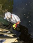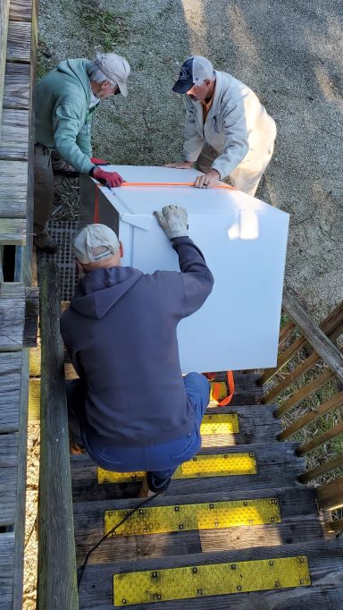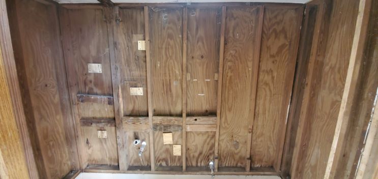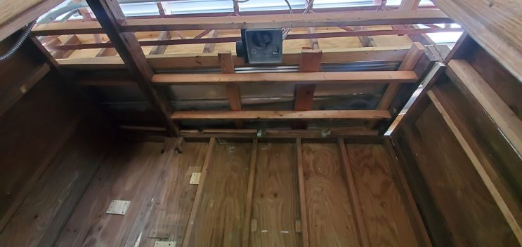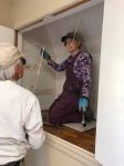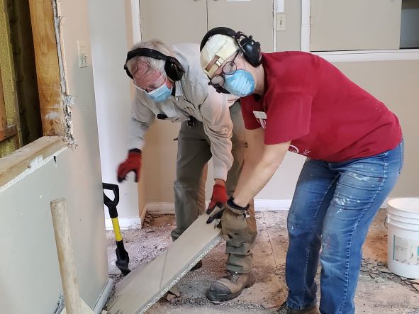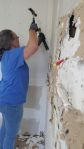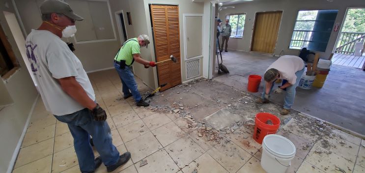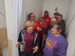 There was also a lot more accomplished at the A-frame cabin. We totally stripped the second floor. All the appliances and cabinets that were removed from the walls were taken to storage. All the trim was removed, the tile removed from the walls and all the floor tile broken up and removed. The tile was very labor intensive work done with sledge hammers, scrapers, pry bars and brute strength. One half of the flooring was on top of cement board that was screwed down with hundreds of screws that also had to be removed. Lots for sore arms and backs at the completion of that work. Most of the team worked on that big project at some point.