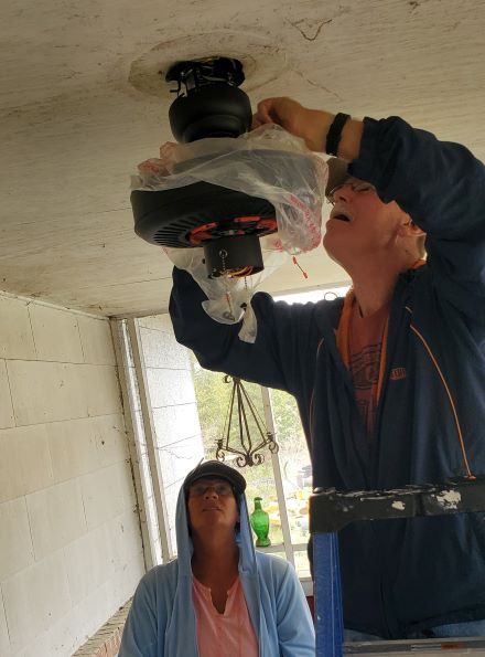 Anne and Dale installing one of the ceiling fans