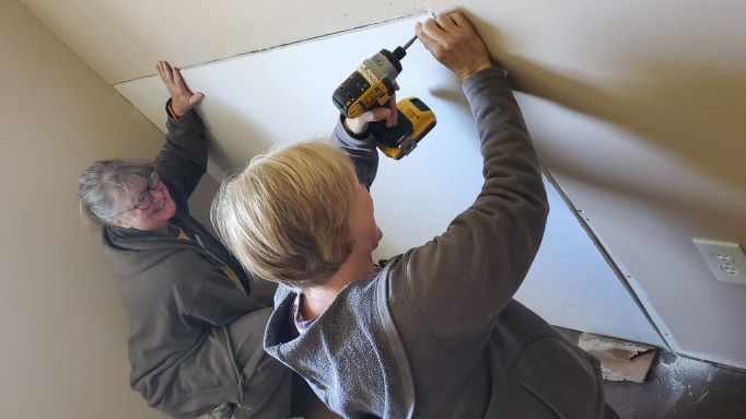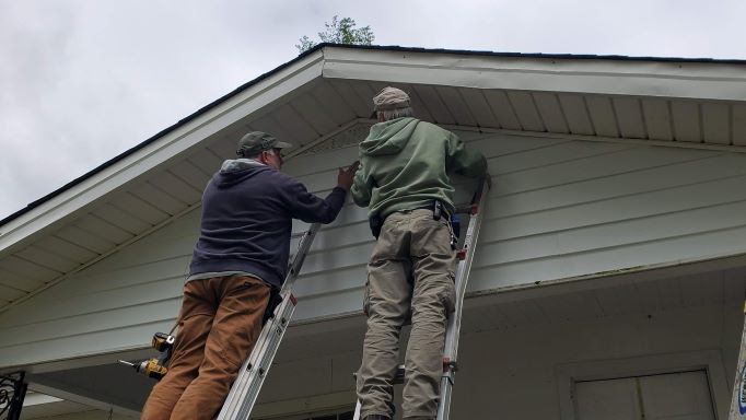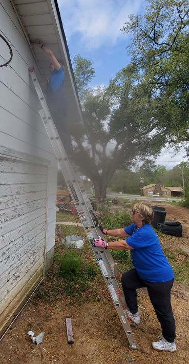 Anne and Dee worked to put the soffit back in place after it was dislodged by the tornado.
