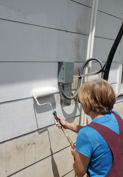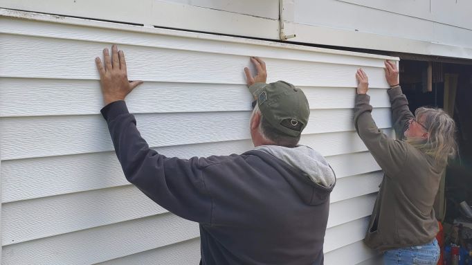 Jim and Anne working on the siding