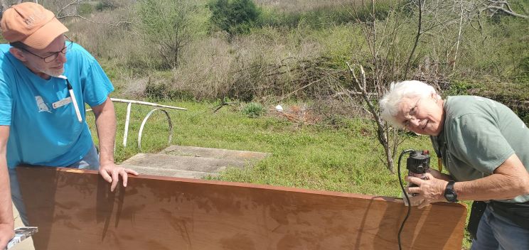 Dave and Stel preparing a door for installation. Many of the openings in the Henry house are non-standard sizes and required modified doors. It is very time consuming.