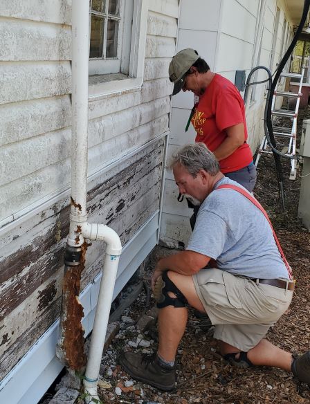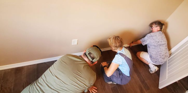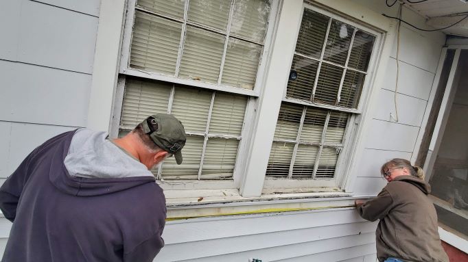 Mark and Sadowna cutting vinyl siding for the doors