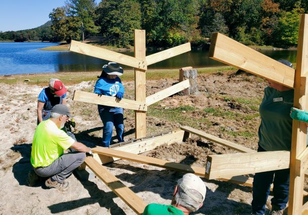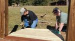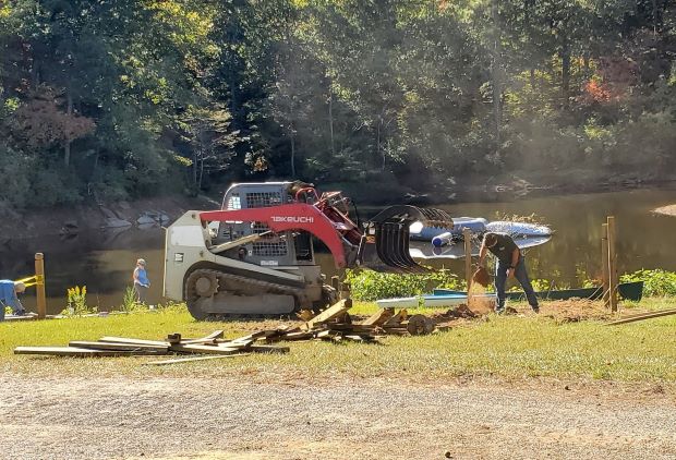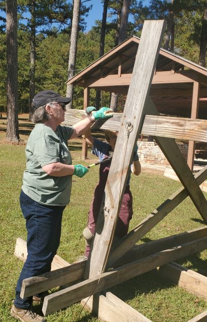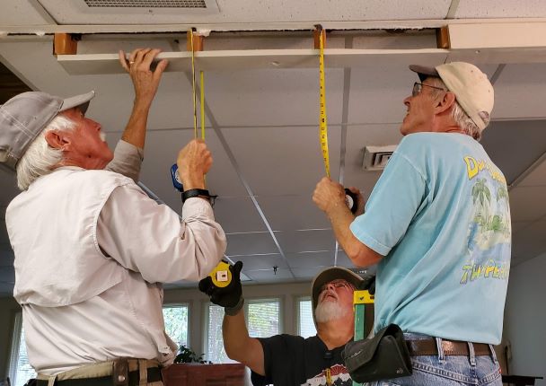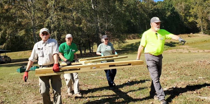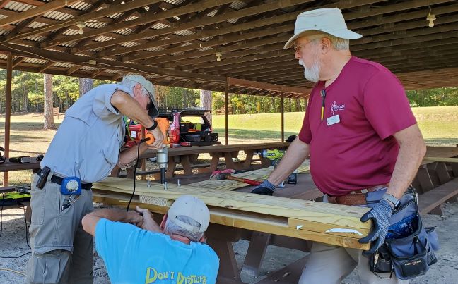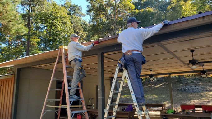 Saturday morning (Oct. 1) we completed our packing and headed to Camp. It was so great to see our wonderful friends Dave and Rita. We haven’t worked with them since Covid and really look forward to spending time with them while working at the Camp. Our leaders are Scott and Teresa who we enjoyed visiting with at annual meeting and we look forward to working with them for the next three weeks. We began our work at the camp repairing the ceiling at the McBee pavilion. We also cleaned and changed light bulbs in the ceiling fans, repaired the roof, a toilet, and painted fascia. The ladies also tackled the floating swim platform and stained and sealed it after replacing some rotten wood. We demoed three canoe racks and all worked to begin construction of two new, heavy duty racks Thursday afternoon. It was a busy week but we accomplished a lot. It’s always good to work at Sumatanga. We camp in view of the lake and get to do our walking around the lake each day.