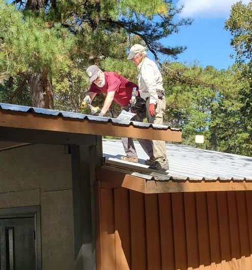 We began work on replacing siding on the outside of the administration building. We removed all the battens and replaced the lower siding on the rear on the building. The siding still needs painting and battens replaced next week. Teresa and Rita have already painted all the battens so they won’t talk long to reinstall. Teresa and Rita removed, cleaned and rearranged all the pictures in the lodge, too. Looks really nice, but sorry we don’t have any pictures of the pictures.