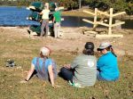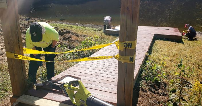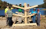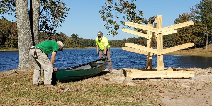 Last Sunday afternoon, after a very good buffet lunch at Charlie B’s in Oneonta, the team gathered for some games. We had a relaxing afternoon and then Monday we jumped right back on the canoe rack project with all hands on deck. The racks are bulky and heavy and took us all to build and get in position. The racks are very sturdy and look good in front of the lake. They are currently holding several canoes and a kayak or two. We hope people will enjoy using them. We also finished up the last few boards on the floating dock, which is still a long way from floating. We need more rain.