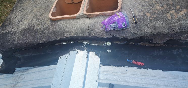 The old rubber flashing and tar had pulled away from the chimney allowing water to get into the ceiling. We applied roof patch to stop the leaks.