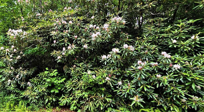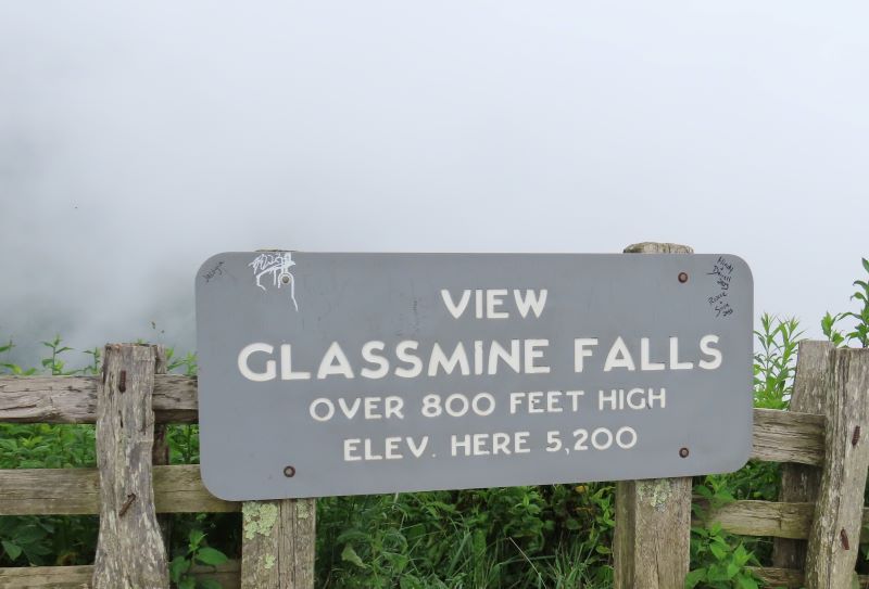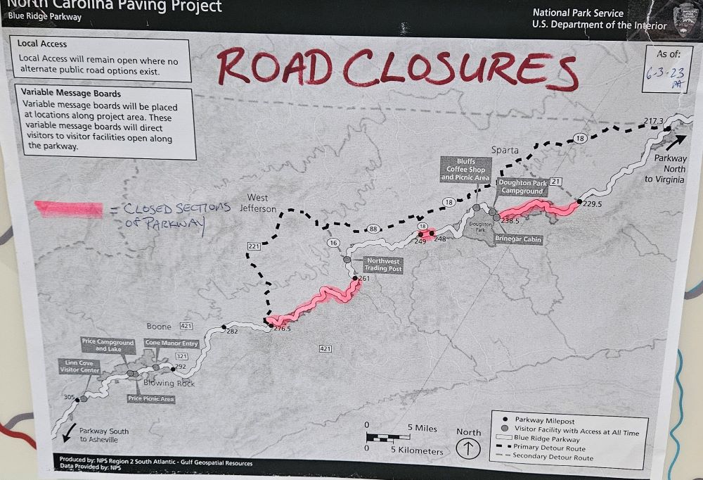For starters, we headed north on the Blue Ridge Parkway beginning in Ashville, NC at the 388.3 mile post.   We have done the section from Ashville to Smokey Mtn NP previously. First stop was at the Visitor’s Center where we got an update on the sections of the parkway closed due to construction, stamped our passport and picked up the current maps, etc.  The rest of the day we spent enjoying the beautiful and peaceful drive.  The spring foliage is still pretty with lots of flowers still blooming, especially at the higher elevations.  Occasional beautiful vistas mixed in with fog and rain – and it was so much cooler!  Morning temps in Johnston were already in the 80’s and on the parkway we were at 64.  We drove to the first road closure which was at about the 280 mile post.